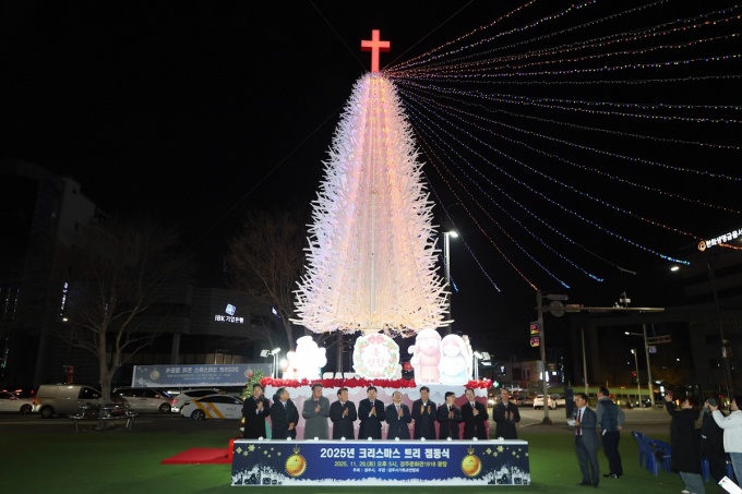 [경주=뉴스핌] 남효선 기자 = 29일 경주문화관1918 광장에서 열린 '2025 성탄절 트리 점등식'에서 주낙영 경주시장과 참석자들이 점등 세리머니를 펼쳤다. 경주시기독교연합회(대표 회장 손성진 목사) 주관으로 열린 성탄 트리 점등식에는 주낙영 경주시장을 비롯한 지역 기독교계 관계자와 시민 등 200여 명이 참석해 성탄의 의미를 되새기며 트리 점등 순간을 함께했다. 성탄 트리는 내년 1월 초까지 경주문화관1918 광장에 설치되어 겨울철 야간 경관을 풍성하게 하며 시민과 관광객에게 따뜻한 볼거리를 선사한다.[사진=경주시]