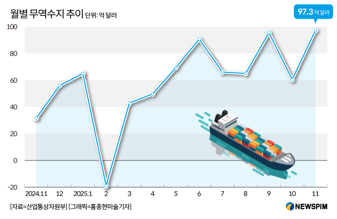 이에 따라 1~11월 누적 수출액은 1526억 달러를 기록했으며, 올해 한 달 남아 있는 시점임에도 기존 연간 최대 수출액인 1419억달러(2024년)를 넘어섰다.
