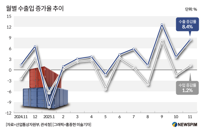 [세종=뉴스핌] 최영수 선임기자 = 지난 11월 수출이 전년동기 대비 8.4% 증가하면서 6개월 연속 증가세를 이어갔다.
