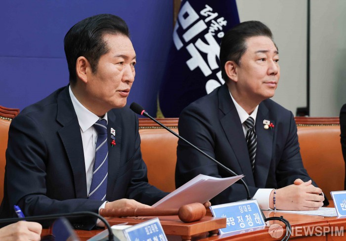 [서울=뉴스핌] 윤창빈 기자 = 정청래 더불어민주당 대표가 1일 서울 여의도 국회에서 열린 최고위원회의에서 모두발언을 하고 있다. 2025.12.01 pangbin@newspim.com