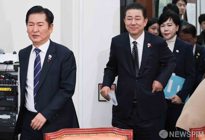 [서울=뉴스핌] 윤창빈 기자 = 정청래 더불어민주당 대표, 김병기 원내대표가 1일 서울 여의도 국회에서 열린 최고위원회의에 참석하고 있다. 2025.12.01 pangbin@newspim.com