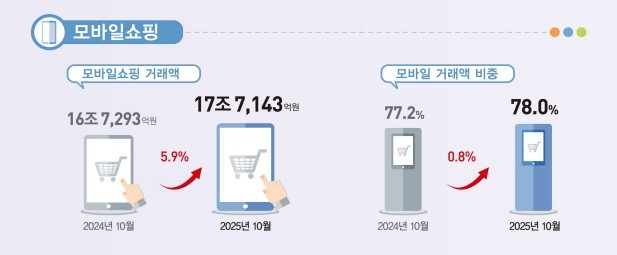지난 10월 모바일 쇼핑 거래액은 17조7143억원으로, 1년 전보다 9850억원(5.9%) 증가했다.