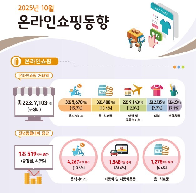 [세종=뉴스핌] 양가희 기자 = 올해 10월 온라인쇼핑 거래액이 1년 전보다 5% 가까이 늘어난 22조7103억원을 기록했다. 상품군별 거래액의 전년 동월 대비 증가 폭은 음식서비스에서 크게 두드러졌는데, 소비쿠폰 등 소비진작 대책 효과로 해석됐다.
