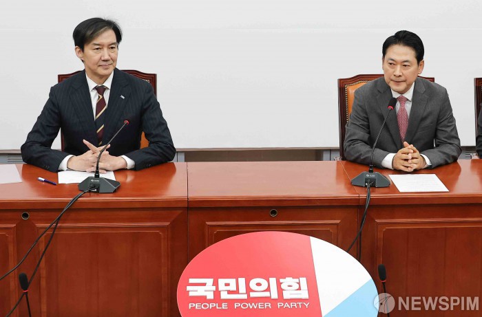 [서울=뉴스핌] 윤창빈 기자 = 장동혁 국민의힘 대표가 1일 서울 여의도 국회에서 조국 조국혁신당 대표를 접견해 모두발언을 하고 있다. 2025.12.01 pangbin@newspim.com