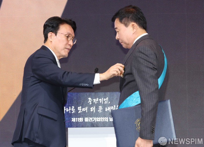 [서울=뉴스핌] 청사사진기자단 = 김민석 국무총리가 1일 오전 서울 중구 소공동 롯데호텔에서 열린 제11회 중견기업인의 날 기념식에서 이동현 오상헬스케어 회장에게 금탑산업훈장을 수여하고 있다. 2025.12.01 photo@newspim.com