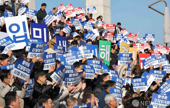 [서울=뉴스핌] 윤창빈 기자 = 자영업자-중소상인-시민사회단체가 1일 서울 여의도 국회 본청 앞에서 열린 온라인 플랫폼법 입법 촉구대회에서 피켓을 들고 있다. 2025.12.01 pangbin@newspim.com