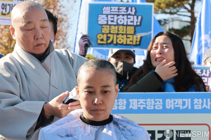 [서울=뉴스핌] 김학선 기자 = 12·29 무안공항 제주항공 여객기 참사 유가족들이 1일 서울 용산구 대통령실 앞에서 항공철도사고조사위원회(항철위)가 국토교통부에서 독립될 때까지 공청회와 중간발표 중단을 촉구하며 삭발을 하고 있다. 2025.12.01 yooksa@newspim.com