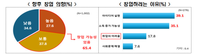 창업 의향이 높다는 응답자의 창업 이유는 자신의 아이디어 실현(39.1%), 소득 증가 가능성(35.1%) 등의 적극적 이유가 많았다. 취업이 어려워 불가피하게 창업에 관심을 가진다는 응답은 17.8%로 조사됐다.