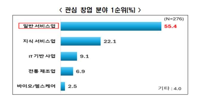 이들의 관심 창업 분야로는 외식, 소매업 등 일반 서비스업이 가장 많았고(55.4%) 지식 서비스업(22.1%), 인공지능(AI) 등 IT 기반 산업(9.1%) 등이 뒤를 이었다.
