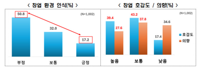 하지만 창업을 뒷받침할 환경은 아쉽다는 의견이 많았다. 창업환경에 대한 부정적 인식이 50.8%로 긍정적 인식(17.2%)보다 약 3배 높았다.