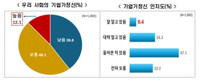한편, 우리 사회의 기업가정신 수준이 높다고 응답한 비율은 12.1%에 불과해 낮다는 인식인 39.8%에 못 미쳤다. 또한, 기업가정신에 대해 '잘 알고 있다'라는 응답 역시 6.4%에 불과해 '들어본 적 있음' 응답 47.1%와 '전혀 모름' 응답 22.2%과 대비됐다.