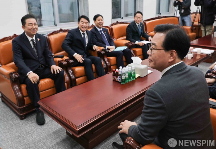 [서울=뉴스핌] 윤창빈 기자 = 김병기 더불어민주당 원내대표, 송언석 국민의힘 원내대표, 구윤철부총리 겸 기획재정부 장관 및 여야 원내수석이 1일 서울 여의도 국회에서 내년도 예산안 협의를 하고 있다. 2025.12.01 pangbin@newspim.com