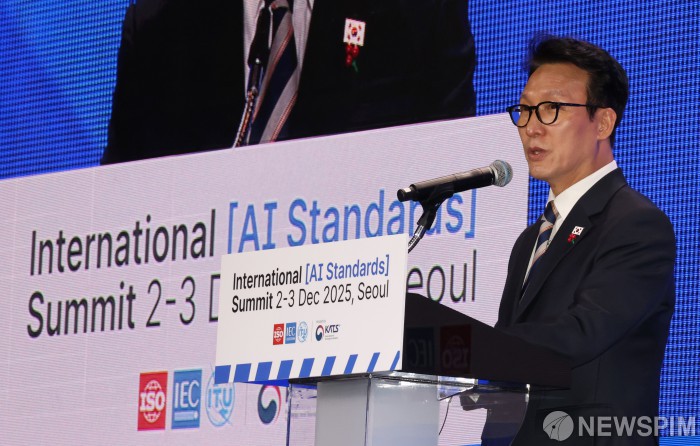 [서울=뉴스핌] 청사사진기자단 = 김민석 국무총리가 2일 오전 서울 중구 신라호텔에서 열린 2025 국제 AI 표준 서밋 개회식에서 환영사를 하고 있다.2025.12.02 photo@newspim.com .