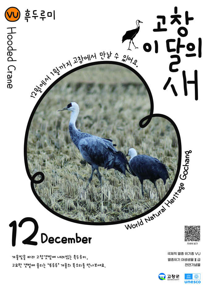 [고창=뉴스핌] 고종승 기자 = 전북 고창군은 12월 '고창갯벌 이달의 새'로 멸종위기 철새 흑두루미를 선정하고 겨울철 고창갯벌의 생태적 중요성을 알리는 캠페인을 진행한다고 2일 밝혔다.