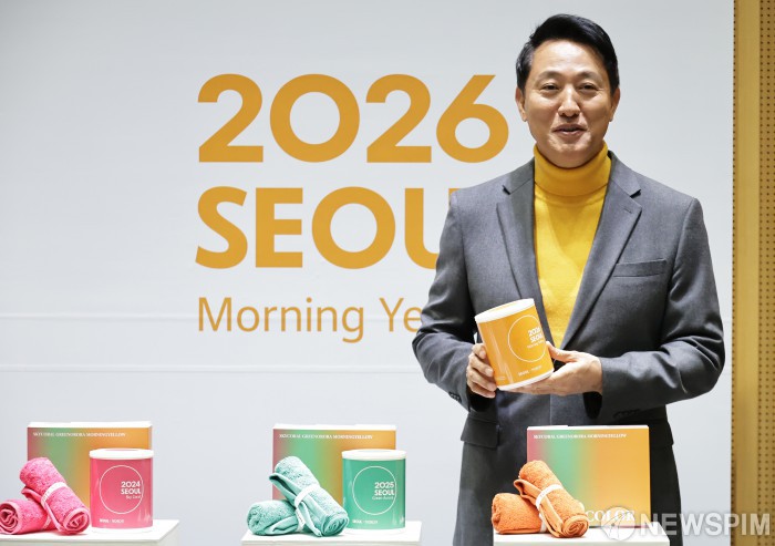 [서울=뉴스핌] 양윤모 기자 = 오세훈 서울시장이 2일 오전 서울시청 3층 대회의실에서 개최된 '2026 서울색-서울빛' 발표 기자설명회에 앞서 모닝엘로우를 기반으로 제작된 굿즈를 들어보이고 있다. 서울시는 2026년 서울색으로 아침해에서 추출한 '모닝옐로우'로 선정했다. 2025.12.02 yym58@newspim.com