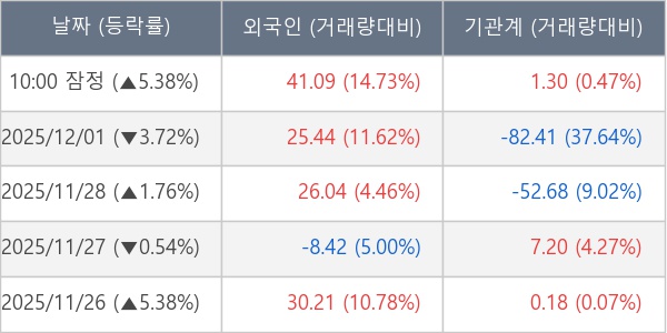 [서울=뉴스핌] 로보뉴스 = 02일 10시 15분 현재 한온시스템(018880)은 외국인과 기관이 각각 41.09 만 주, 1.30 만 주 순매수(잠정) 하면서 전일 대비 5.38% (현재가 3,820원) 상승하고 있다.