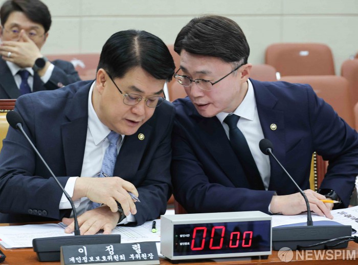 [서울=뉴스핌] 윤창빈 기자 = 류제명 과학기술정보통신부 2차관, 이정렬 개인정보보호위원회 부위원장이 2일 서울 여의도 국회 과학기술정보방송통신위원회에서 열린 쿠팡 침해사고 관련 현안질의에서 대화를 나누고 있다. 2025.12.02 pangbin@newspim.com
