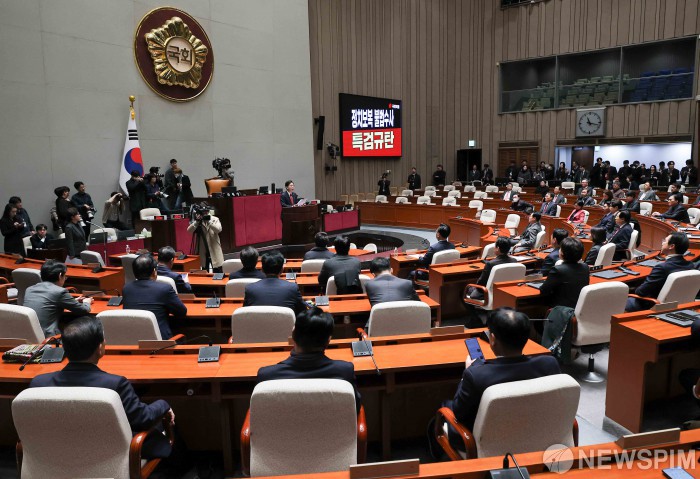 [서울=뉴스핌] 윤창빈 기자 = 송언석 국민의힘 원내대표가 2일 서울 여의도 국회에서 열린 의원총회에서 모두발언을 하고 있다. 2025.12.02 pangbin@newspim.com