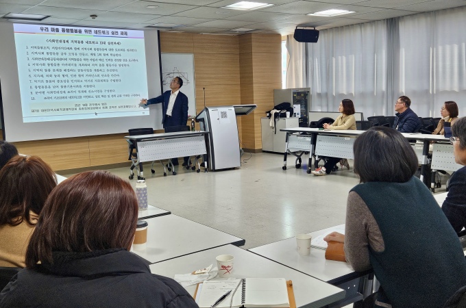 한국사회연대경제연구소 김기태 소장이 중앙정부 돌봄 정책 변화와 지역 역할에 대해 강의했으며 참석자들은 의료, 요양, 복지, 주거 등 다양한 돌봄 서비스의 연계·통합에 주목했다.
