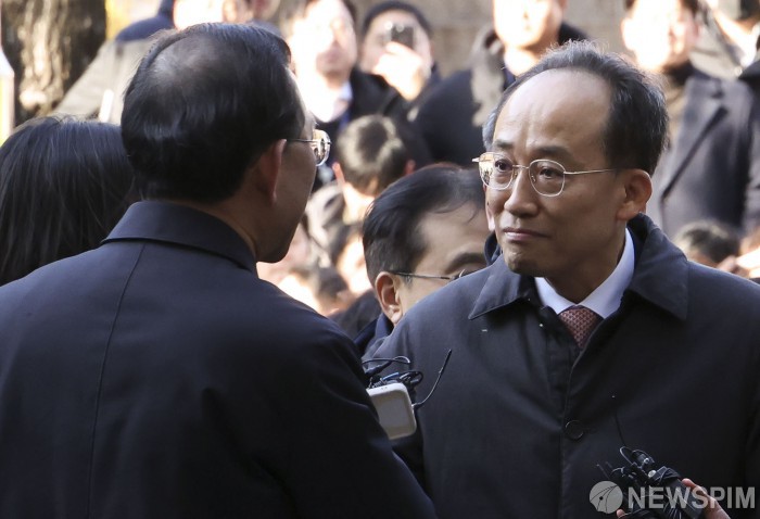 [서울=뉴스핌] 최지환 기자 = 국회의 12·3 비상계엄 해제 의결 방해 의혹을 받는 추경호 전 국민의힘 원내대표가 2일 오후 서울 서초구 서울중앙지방법원에서 열린 영장실질심사(구속 전 피의자 심문)에 출석하며 주호영 국회부의장과 인사하고 있다. 2025.12.02 choipix16@newspim.com