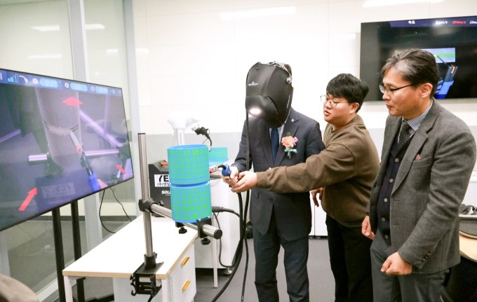 | 3일 한국폴리텍대학 순천캠퍼스 뿌리산업특화교육센터에서 정경훈 기획이사가 용접시뮬레이터 실습 체험을 하며 설명을 듣고 있다. [사진=한국폴리텍대학] 2025.12.03 jsh@newspim.com |