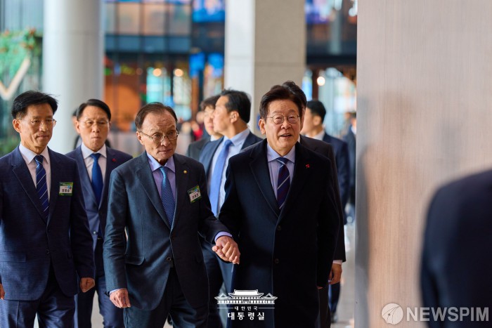 [서울=뉴스핌] 이재명 대통령이 2일 경기도 고양 킨텍스에서 열린 제22기 민주평화통일자문회의 출범식을 앞두고 이해찬 수석부회장과 이동하고 있다. [사진=대통령실] 2025.12.02 photo@newspim.com