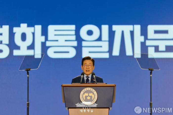 [서울=뉴스핌] 이재명 대통령이 2일 경기도 고양 킨텍스에서 열린 제22기 민주평화통일자문회의 출범식에서 연설을 하고 있다. [사진=대통령실] 2025.12.02 photo@newspim.com