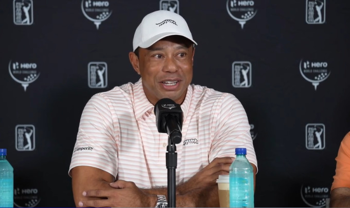 [서울=뉴스핌] 장환수 스포츠전문기자= 타이거 우즈가 3일 바하마에서 열린 히어로 월드 챌린지 공식 기자회견에서 밝은 표정으로 근황을 전하고 있다. [사진=PGA 중계화면 캡처] 2025.12.03 zangpabo@newspim.com