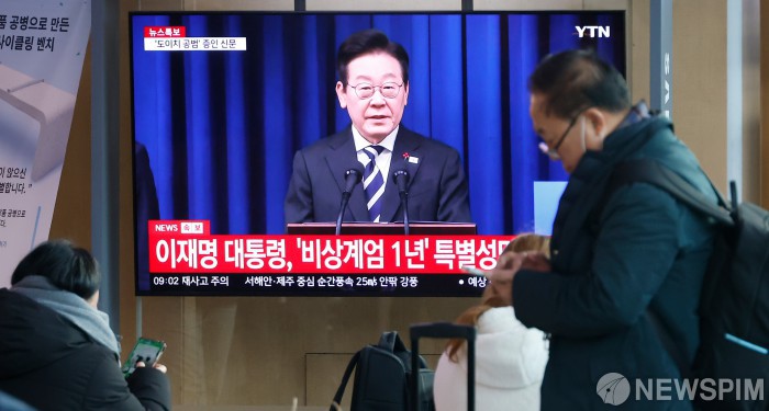 [서울=뉴스핌] 류기찬 기자 = 12·3 비상계엄 1주년인 3일 오전 서울역 대합실에서 시민들이 이재명 대통령의 대국민 특별성명 발표를 시청하고 있다. 2025.12.03 ryuchan0925@newspim.com