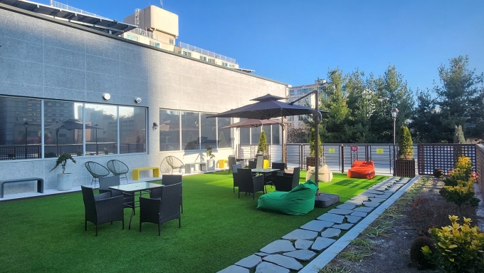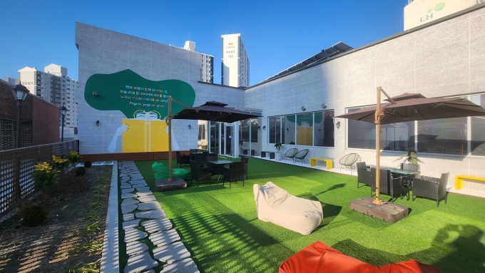산본도서관(군포시 광정로 96) 3층 옥상(168㎡)은 기존 유휴 공간을 활용해 야외 테이블 세트, 인조잔디, 목재 데크, 소규모 정원, 빈백 등 편안한 휴게시설을 갖춘 복합 힐링 공간으로 재정비되었다.