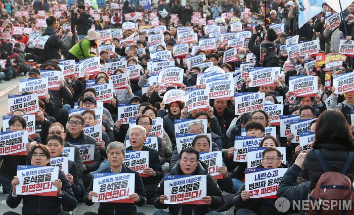 | 지난 4월 1일 민주노총·한국노총 양대 노총이 서울 광화문 월대 앞에서 24시간 철야 집중행동 선포 결의대회를 열고 윤석열 전 대통령(당시 대통령)의 파면을 촉구했다. [사진=뉴스핌 DB] |