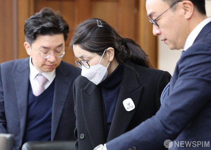 [서울=뉴스핌] 사진공동취재단 = 도이치모터스 주가조작과 명태균 공천개입, 통일교 청탁·뇌물 수수 의혹 혐의 등으로 구속기소 된 김건희 여사가 3일 서울 서초구 서울중앙지방법원에서 열린 자본시장법 위반 혐의 결심 공판에 출석하고 있다. 2025.12.03 photo@newspim.com