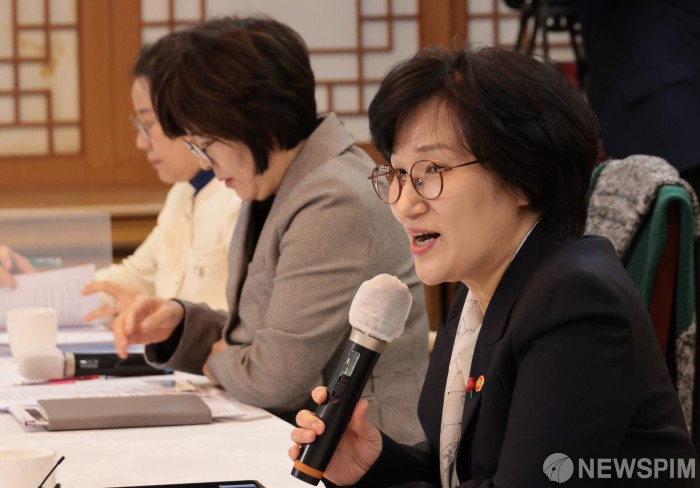 [서울=뉴스핌] 이길동 기자= 원민경 성평등가족부 장관이 3일 서울 종로구 정부서울청사에서 열린 금융분야 여성 임원 현장 소통 간담회에서 인사말을 하고있다.2025.12.03 gdlee@newspim.com