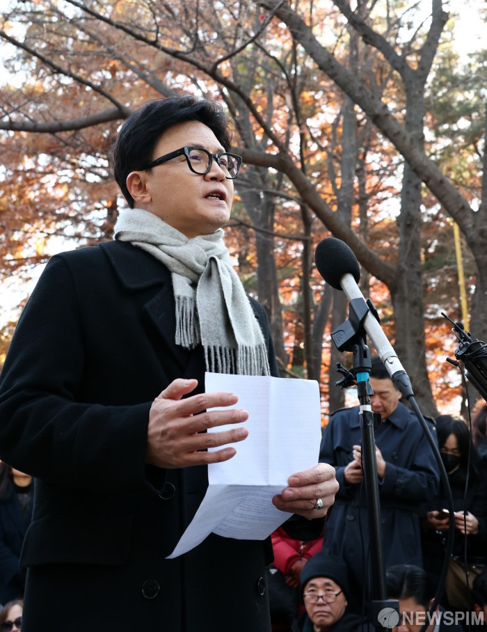 [서울=뉴스핌] 최지환 기자 = 한동훈 전 국민의힘 대표가 3일 오후 여의도 국회 국회도서관 앞에서 열린 12.3 비상계엄 1주년 관련 기자회견에서 발언하고 있다. 2025.12.03 choipix16@newspim.com