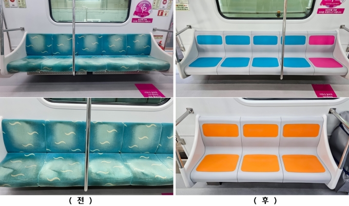 | 인천지하철 2호선 전동차 의자 교체 전후 모습 [사진=인천교통공사] |