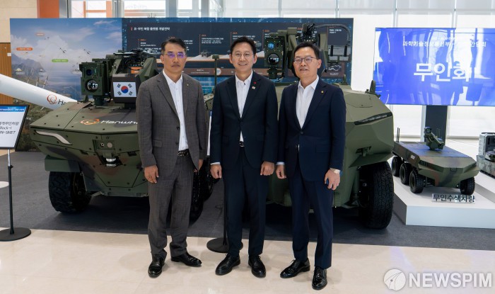 [서울=뉴스핌] 배경훈 부총리 겸 과학기술정보통신부 장관이 3일 오후 대전광역시 유성구 한화에어로스페이스 대전R&D캠퍼스를 방문해 한화에어로스페이스 및 한화시스템 연구개발 전시물 앞에서 기념촬영을 하고 있다. [사진=한화에어로스페이스] 2025.12.03 photo@newspim.com