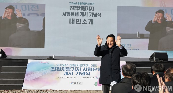 [서울=뉴스핌] 양윤모 기자 = 오세훈 서울시장이 3일 오후 서울 노원구 노원로 573번지 창동차량기지에서 개최된 '진접차량기지 시험운행 개시 기념행사'에 참석해 주민들에게 인사하고 있다. 진접차량기지는 2018년 착공해 지난 11월부터 종합 시험 운행 중이며, 진접으로 이동하는 창동차량기지 일대는 2028년 착공을 목표로 '강북권 대개조-강북 전성시대' 사업의 핵심인 서울디지털바이오시티(S-DBC)가 들어선다. 2025.12.03 yym58@newspim.com