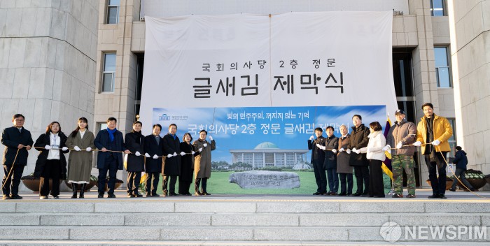 [서울=뉴스핌] 최지환 기자 = 우원식 국회의장이 3일 오후 서울 여의도 국회에서 열린 국회의사당 2층 정문 글새김 제막식에서 참가자들과 문구를 공개하고 있다. 2025.12.03 choipix16@newspim.com