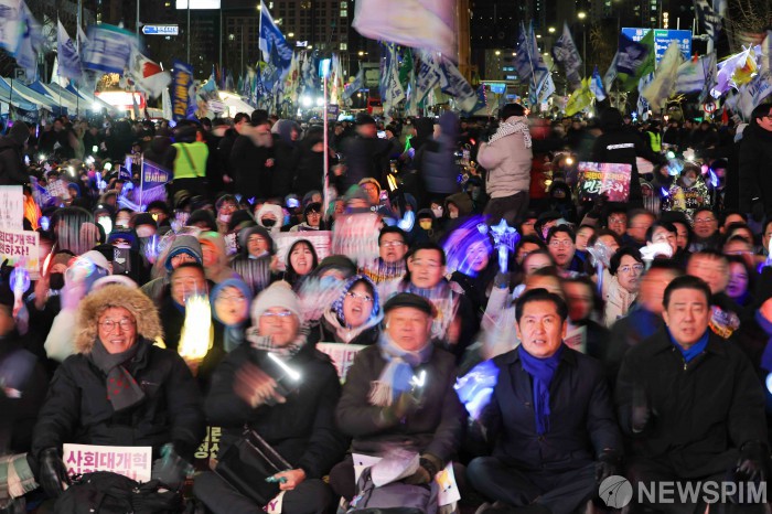 [서울=뉴스핌] 윤창빈 기자 = 3일 서울 여의도 국회의사당 정문 앞에서 열린 12.3 내란외환 청산과 종식, 사회대개혁 시민대행진에서 시민들이 응원봉을 들고 구호를 외치고 있다. 2025.12.03 pangbin@newspim.com