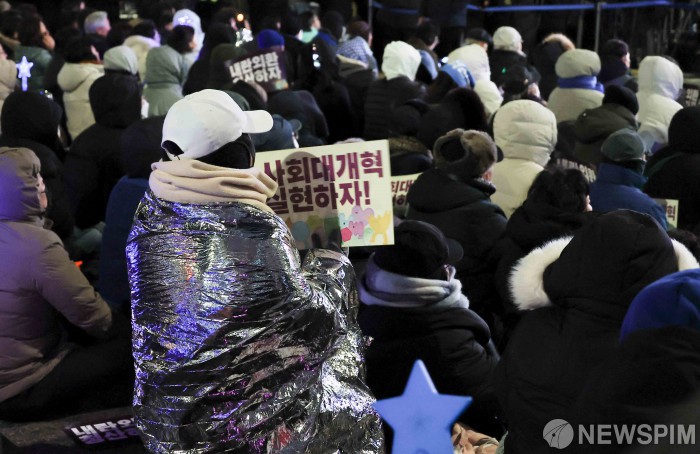 [서울=뉴스핌] 윤창빈 기자 = 3일 서울 여의도 국회의사당 정문 앞에서 열린 12.3 내란외환 청산과 종식, 사회대개혁 시민대행진에서 시민들이 응원봉을 들고 구호를 외치고 있다. 2025.12.03 pangbin@newspim.com