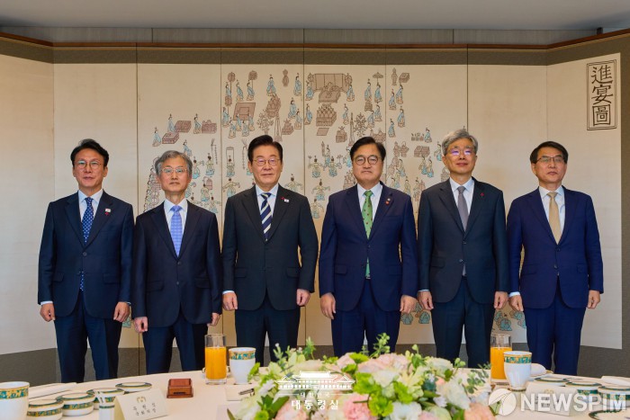 [서울=뉴스핌] 이재명 대통령이 3일 서울 용산구 대통령실에서 열린 5부 요인 초청 오찬에서 기념촬영을 하고 있다. 왼쪽 부터 김민석 국무총리, 조희대 대법원장, 이 대통령, 우원식 국회의장, 김상환 헌법재판소장, 노태악 중앙선거관리위원장. [사진=대통령실] 2025.12.03 photo@newspim.com