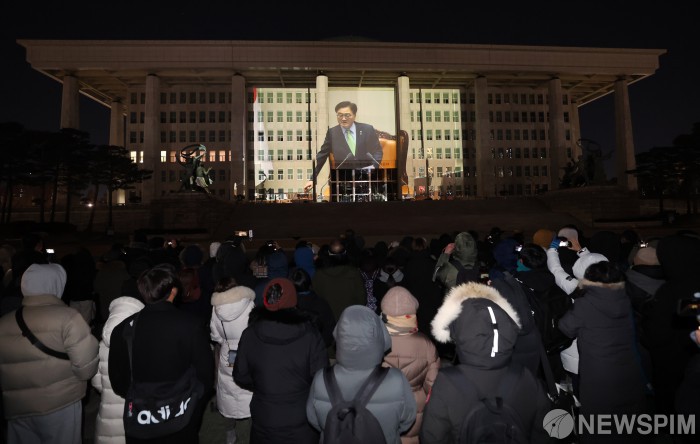 [서울=뉴스핌] 김학선 기자 = 12·3 비상계엄 사태 1년을 맞은 3일 서울 여의도 국회에서 계엄 해제 당시 기억을 되새기는 '미디어 파사드' 행사가 진행되고 있다. 2025.12.03 yooksa@newspim.com