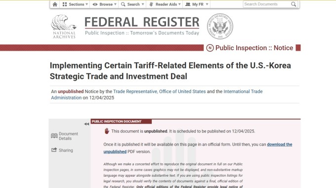 미 상무부 국제무역청(ITA)과 무역대표부(USTR)는 이날 '한미 전략적 무역·투자 협정(U.S.-ROK Strategic Trade and Investment Deal)' 이행을 위한 관세 조정 내용을 연방 관보(Federal Register)에 온라인 사전 게재했다. 공식 게재는 4일 이뤄질 예정이다.