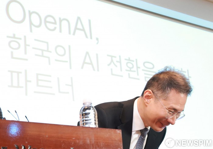 [서울=뉴스핌] 김학선 기자 = 김경훈 OpenAI 코리아 총괄 대표가 4일 서울 중구 웨스틴조선호텔에서 가진 선임 후 첫 기자간담회에 참석해 인사하고 있다. 이날 간담회는 ChatGPT 출시 3년 이후 나타난 AI 도입 현황을 소개하고 기업 중심의 AI 전환 전략과 실제 효과를 논의하기 위해 마련됐다. 2025.12.04 yooksa@newspim.com