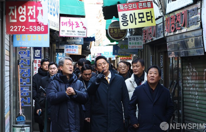 [서울=뉴스핌] 양윤모 기자 = 오세훈 서울시장이 4일 오전 서울 종로구 세운지구를 찾아 현장을 살펴보고 있다. [공동취재] 2025.12.04 yym58@newspim.com