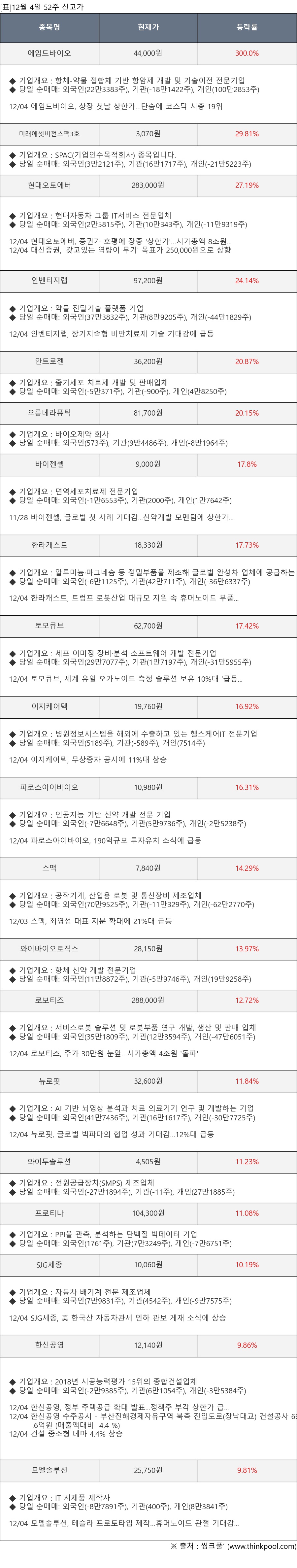 ※ 관련 종목: 에임드바이오, 미래에셋비전스팩3호, 현대오토에버, 인벤티지랩, 안트로젠, 오름테라퓨틱, 바이젠셀, 한라캐스트, 토모큐브, 이지케어텍, 파로스아이바이오, 스맥, 와이바이오로직스, 로보티즈, 뉴로핏, 와이투솔루션, 프로티나, SJG세종, 한신공영, 모델솔루션