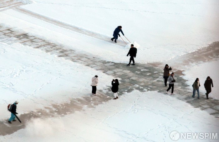 [서울=뉴스핌] 이길동 기자 =5일 오전 서울 종로구 경복궁에서 관계자들이 어젯밤 내린 눈을 치우는 가운데 관광객들이 눈을 배경으로 사진을 찍고 있다.2025.12.05 gdlee@newspim.com