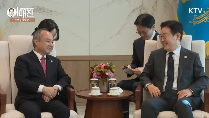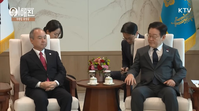 이재명 대통령이 5일 용산 대통령실에서 손정의 소프트뱅크그룹 회장과 인공지능(AI) 협력과 투자를 위한 면담을 하고 있다. [사진=KTV]