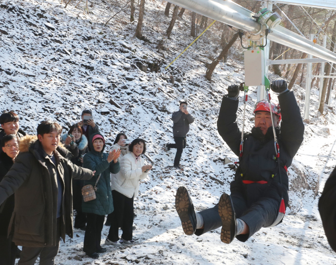 짚트랙 체험하는 이범석 청주시장. [사진=청주시] 2025.12.06 baek3413@newspim.com