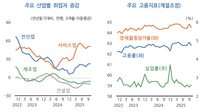 구체적으로 KDI는 "건설업 부진이 장기화되고 있으나, 소비는 금리 인하가 시차를 두고 반영되는 가운데 정부 지원 정책도 지속되며 개선세를 이어가고 있다"며 "이에 따라 서비스업 생산이 양호한 흐름을 보이면서 전산업 생산의 완만한 증가세를 견인했다. 소비와 밀접한 부문의 고용도 부진이 점차 완화되는 모습"이라고 풀이했다.